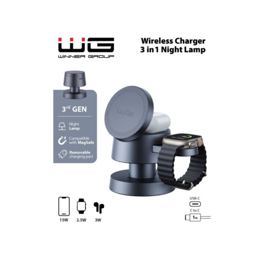 Tato elegantní 3v1 bezdrátová nabíječka s vestavěnou LED lampičkou je ideálním řešením pro moderní domácnosti a kanceláře. Nabízí rychlé a bezpečné bezdrátové nabíjení tří zařízení současně – iPhone, Apple Watch a bezdrátová sluchátka nebo Android telefon. Stylový a funkční design zaručí, že se stane nepostradatelnou součástí vašeho pracovního stolu nebo nočního stolku.