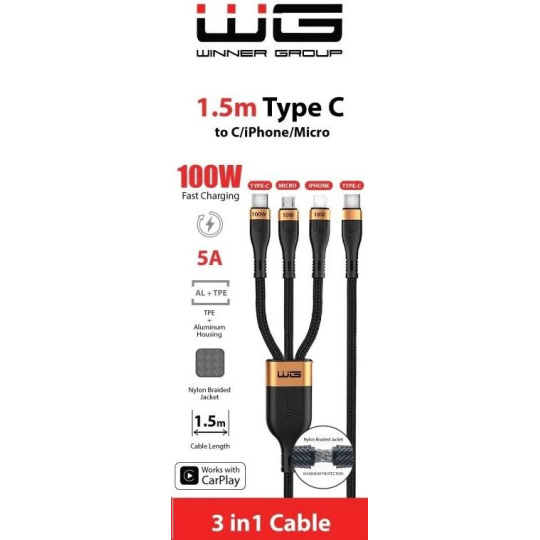 WG - Datový kabel 3v1 Type-C na Type-C na Lightning na Micro USB, 1,5 metrů, 5A, 100W, černá