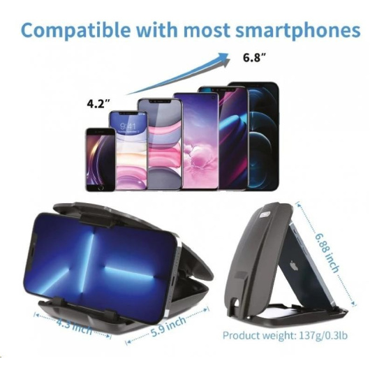 Tento držák spolehlivě udrží váš mobil nebo GPS navigaci na svém místě. Určen je pro instalaci na palubní desku pomocí gelové nano podložky a 3M lepící pásky. Držák vyniká minimalistickým provedením, takže vám nebude v autě nijak překážet. Navíc nabízí ohromnou stabilitu, a tak se skvěle hodí i do náročnějšího terénu. Telefon přitom nemá šanci z držáku vypadnout, čemuž napovídá i fakt, že disponuje protiskluzovým uchycením a samosvorným zavíráním. Přístroj si navíc můžete natočit, jak vám to bude vyhovovat, tedy vodorovně i svisle..