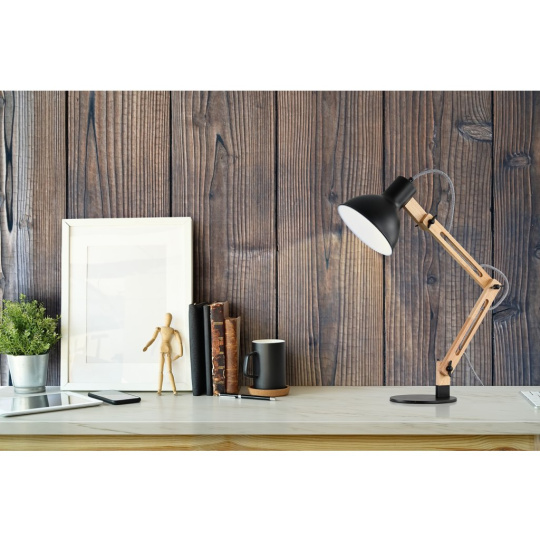 Stolní lampa Beauty & Wood zajistí vynikající světelné podmínky pro příjemnou a pohodlnou práci. Oceníte design ze dřeva a kovu, který vynikne v jakémkoli interiéru. Díky třem nastavitelným spojům lze světelný paprsek optimálně nastavit podle potřeb. Lampu zapnete a vypnete pomocí vestavěného vypínače kabelu. Lampa je vhodná pro žárovky s paticí E27 a třídou energetické účinnosti od A ++ do E, proto lze použít i velmi úsporné LED žárovky.