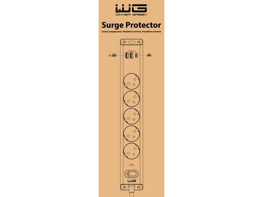 Přepěťová ochrana WG 5 slotů, 2x USB-A, 1x USB-C