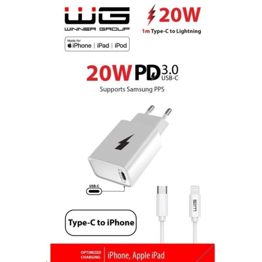 WG - Síťová nabíječka 1x USB-C, PD 20W + kabel Type-C na Lightning MFI, white