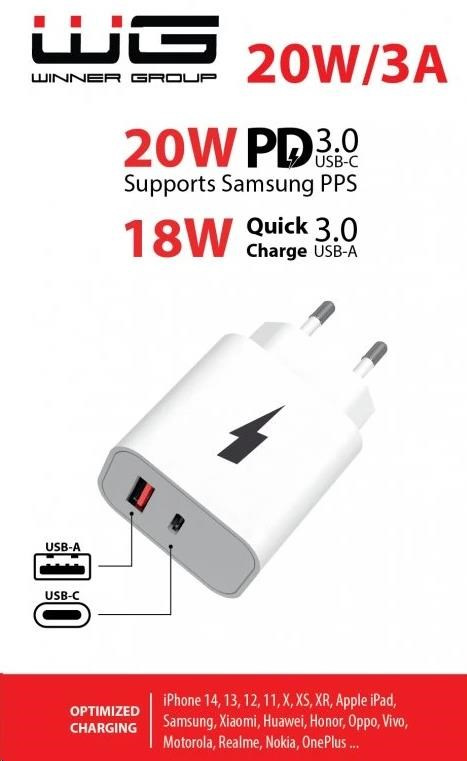 WG - Síťová nabíječka 2x USB, 1x USB-C PD 20W + 1x USB-A QC 3.0 18W, bílá