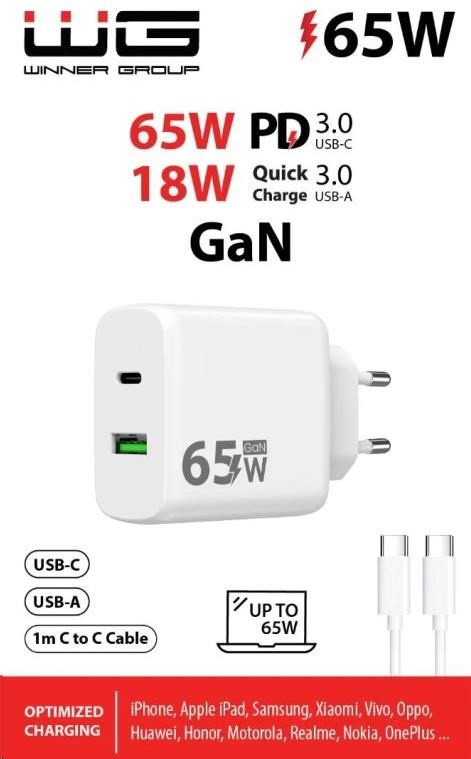 WG - Síťová nabíječka GaN 2x USB 65W, 1x USB-C PD 65W + 1x USB-A QC 3.0 18W, kabel Type-C na Type-C, bílá