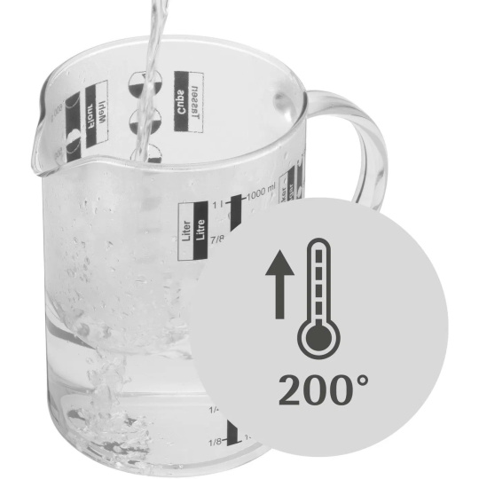 - Tepelně odolné sklo: Vyrobeno z vysoce kvalitního skla, které odolává vysokým teplotám, což umožňuje odměřování horkých tekutin přímo z hrnce.