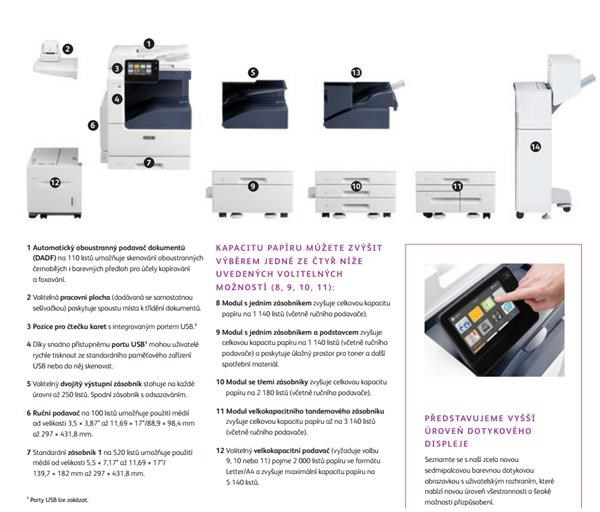 - Zabezpečení: Zabezpečená správa zařízení: Xerox® Printer Security Audit Service (automatická konfigurace nastavení zabezpečení, sledování a automatické řešení problémů), správ digitálních certifikátů, reporting SIEM, interaktivní hlášení řídicích panelů