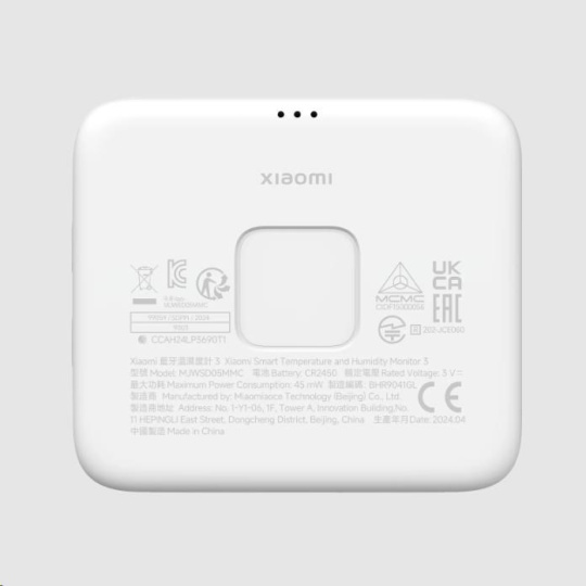 • Obsah balení: 1× chytrý monitor teploty a vlhkosti Xiaomi 3, 1× stojánek, 1× řešení pro upevnění na stěnu, 1× uživatelská příručka, 1× informační karta pro synchronizaci času, 1× záruční list